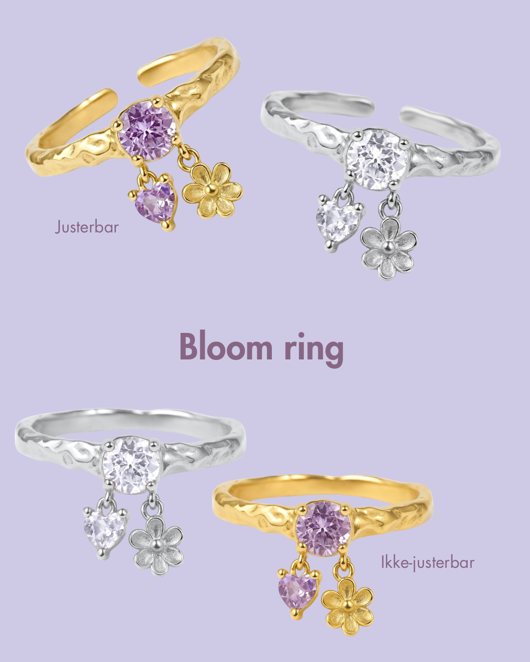 Bloom-ringen minner deg på at ting tar tid – og at du fortsatt vokser. Hjertet og blomsten symboliserer kjærlighet, håp og nye begynnelser. Et smykke for deg som finner styrke i det enkle og fortsetter å blomstre, uansett hva livet bringer.