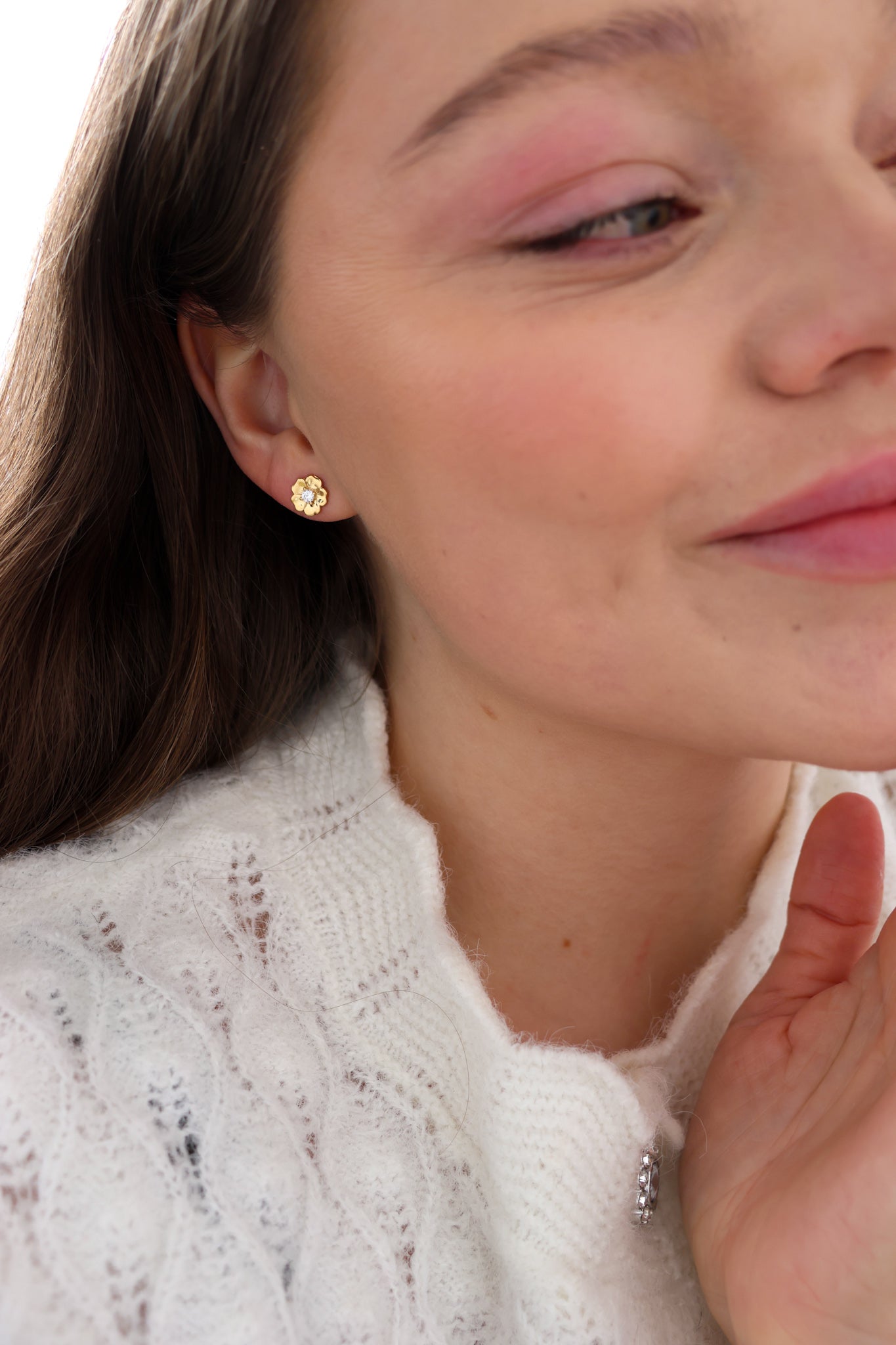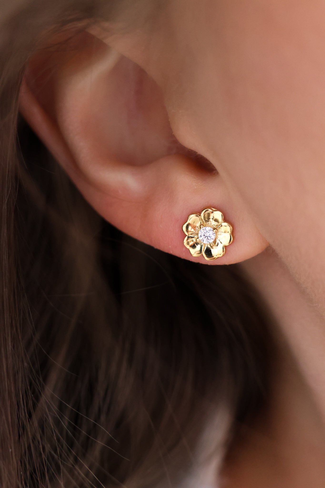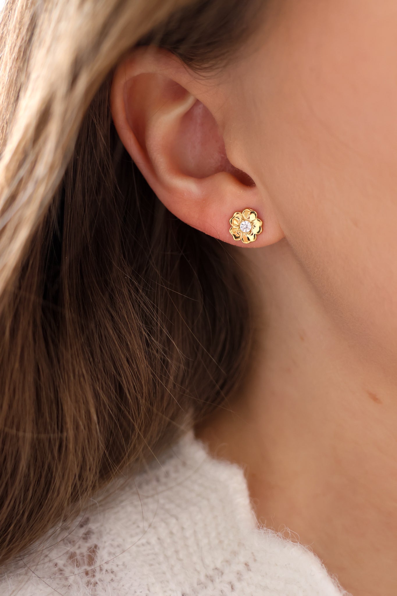 En liten blomst formet av myke hjerter, med en klar sten i midten som fanger lyset diskret. Delikat og feminin, men samtidig enkel nok til å brukes hver dag. Perfekt alene i hvert øre – eller kombinert med andre små favoritter for et personlig uttrykk. En subtil påminnelse om det som betyr mest.<br><br>